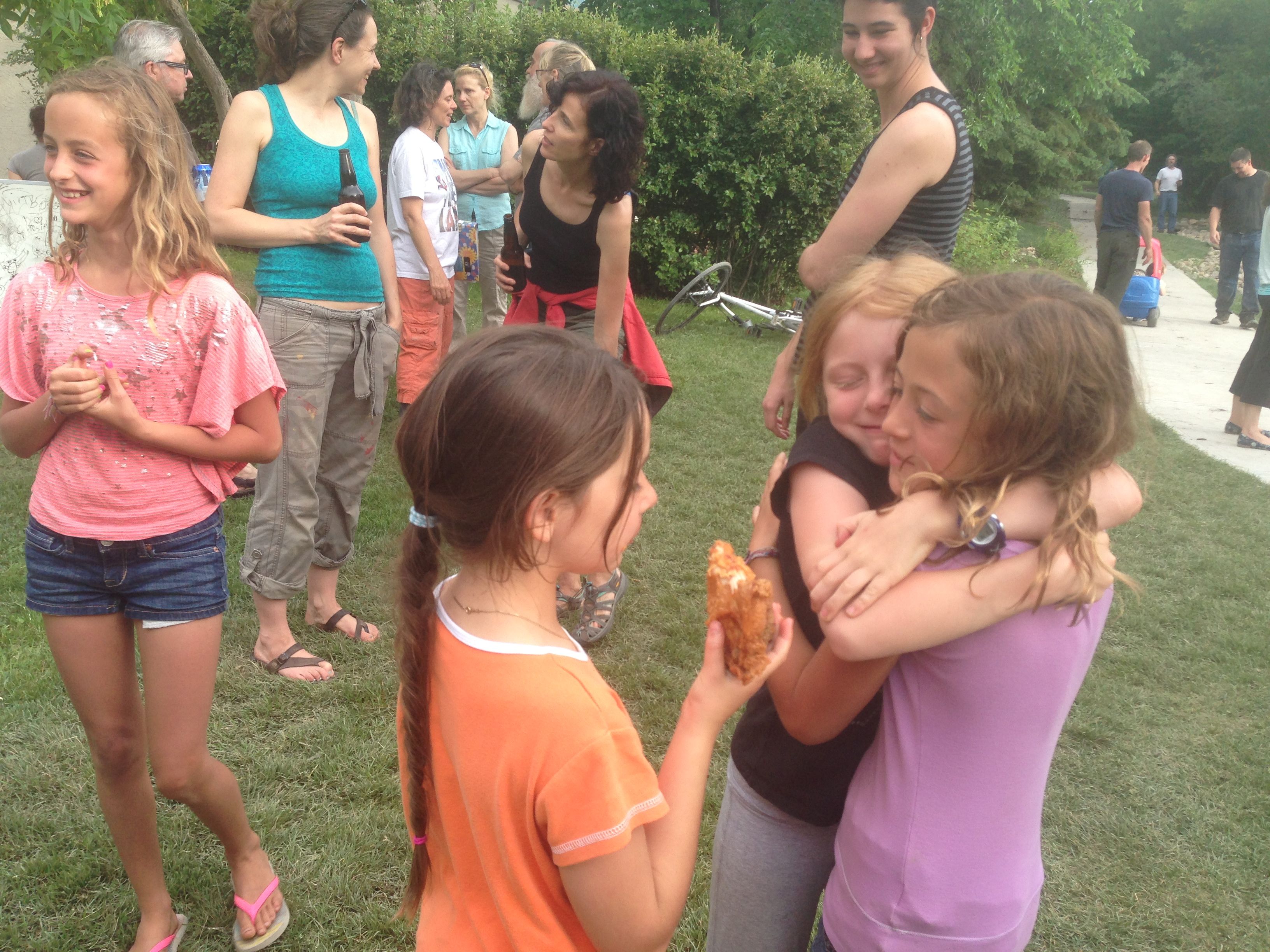 New Year’s. Summer Solstice (even last year’s one). Halloween. Impromptu sleep-overs all over; in the morning, a kid head-count. Six kids traipse down my stairs. There are five clambering up yours. “Does your mother know you’re here?” “I think so… oh, isn’t that her, at your door?” It is. “Coffee delivery!” Oh, yes.