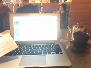 I have no real deadlines. A couple of rewrites. Follow-ups. Post-conference crash. Am I tired, sick, or just slow? Slow. The smoke is bad. I go to yoga, meet a friend for yucca fries, solo sheesha date, take Flora shopping, cuddle Ender a lot, I want a time-out, a vacation—I grab a night—Co-op birthday party, yes, I washed the kitchen floor but the stairs are fuzzy, ha ha.