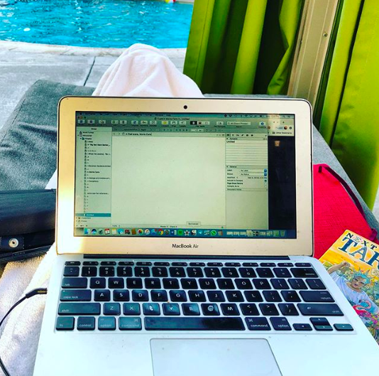 I close the Scrivener document—then open it, export the file to Word. Repeat the process for Episode 1 and 2. Email all three to all of my email addresses. My back-up. I am, after all, working by the pool…