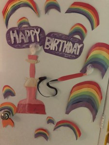 My family made a birthday door for me, and got me two chocolate croissants and a tangerine slice peel clematis, also, lots of chocolate wrapped in a beautiful blue and gold pashmina. There are happy birthday emails and texts and phone calls and even though it’s raining, I know my parents will come and visit me on the porch and maybe you will come and we will go for a walk and know what? If we go for a walk, fuck it, let’s have a $1200 hug, because it’s my birthday and I’m not sure I can do this anymore.
