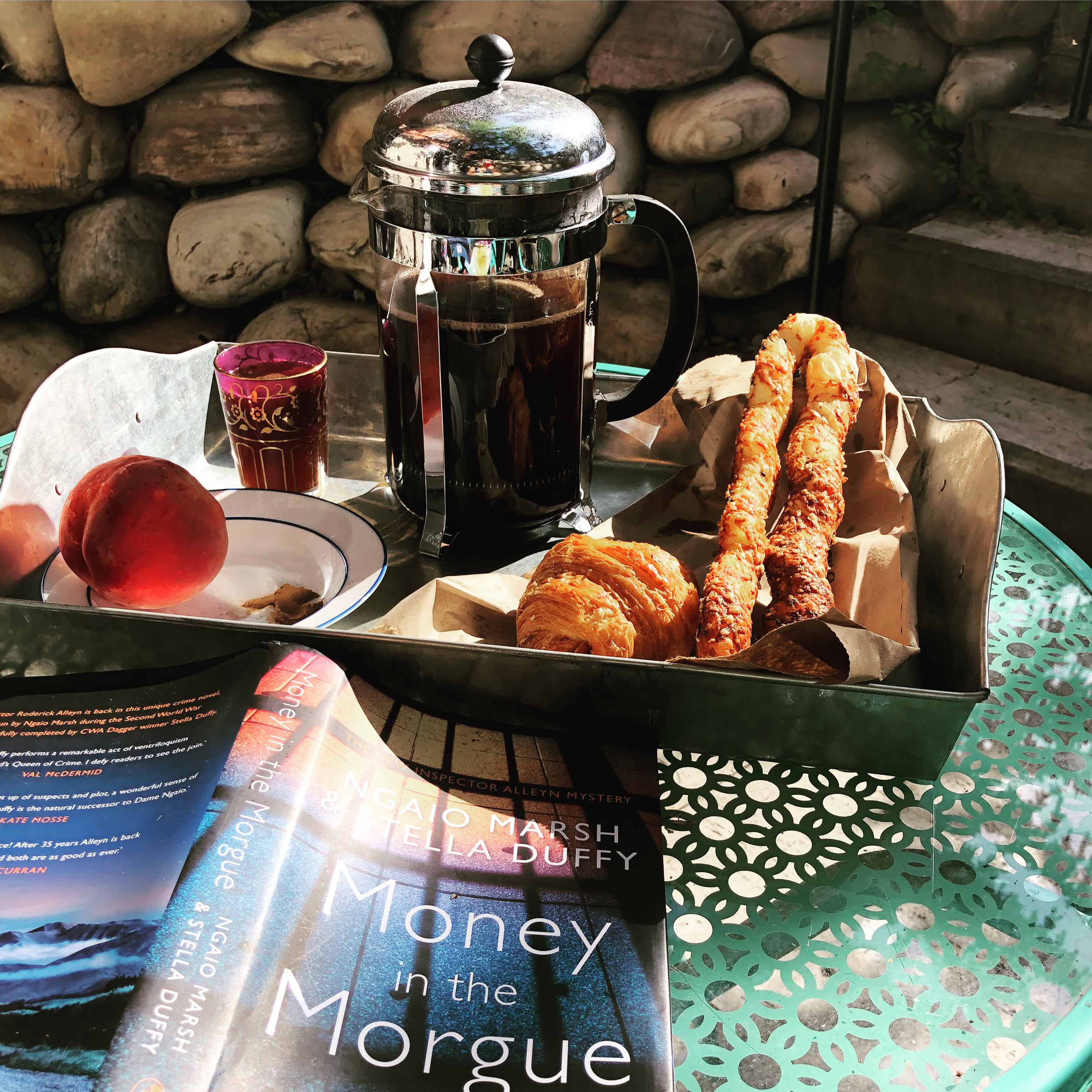 Deadline, and another one—and also this, that, and the other—and now I’m done, out of steam, it’s too hot, thirsty, sick of drinking water, cold tea? I stretch out in a makeshift chaisse lounge with a book, Stella Duffy’s continuation of Ngaio Marsh’s Money in the Morgue. It was not, from what I can gather, a great commercial success. But those of us who can’t get enough Ngaio buy it, read it—just as we devour third-rate Jane Austen retellings, Sherlock Holmes pastiches.