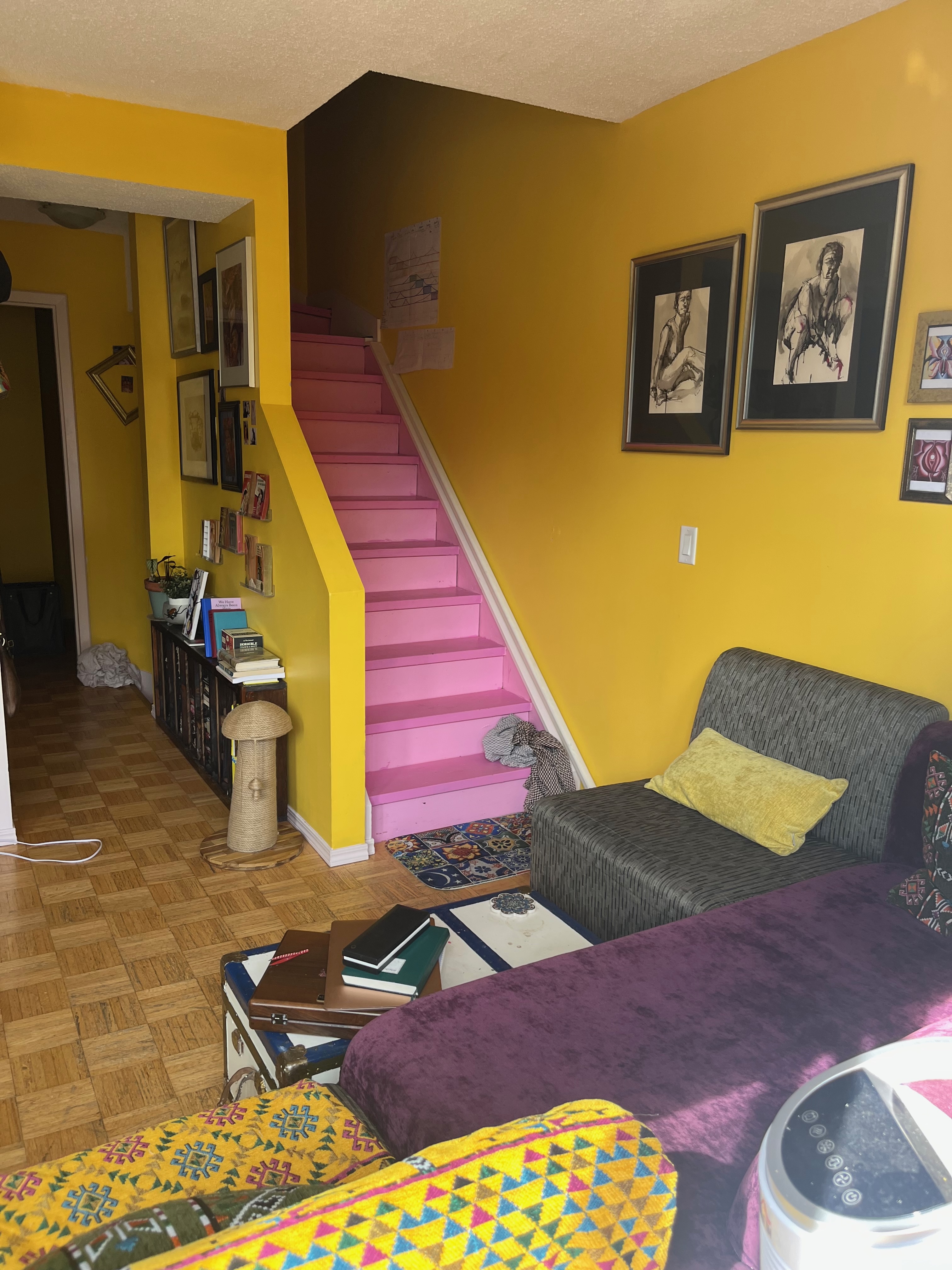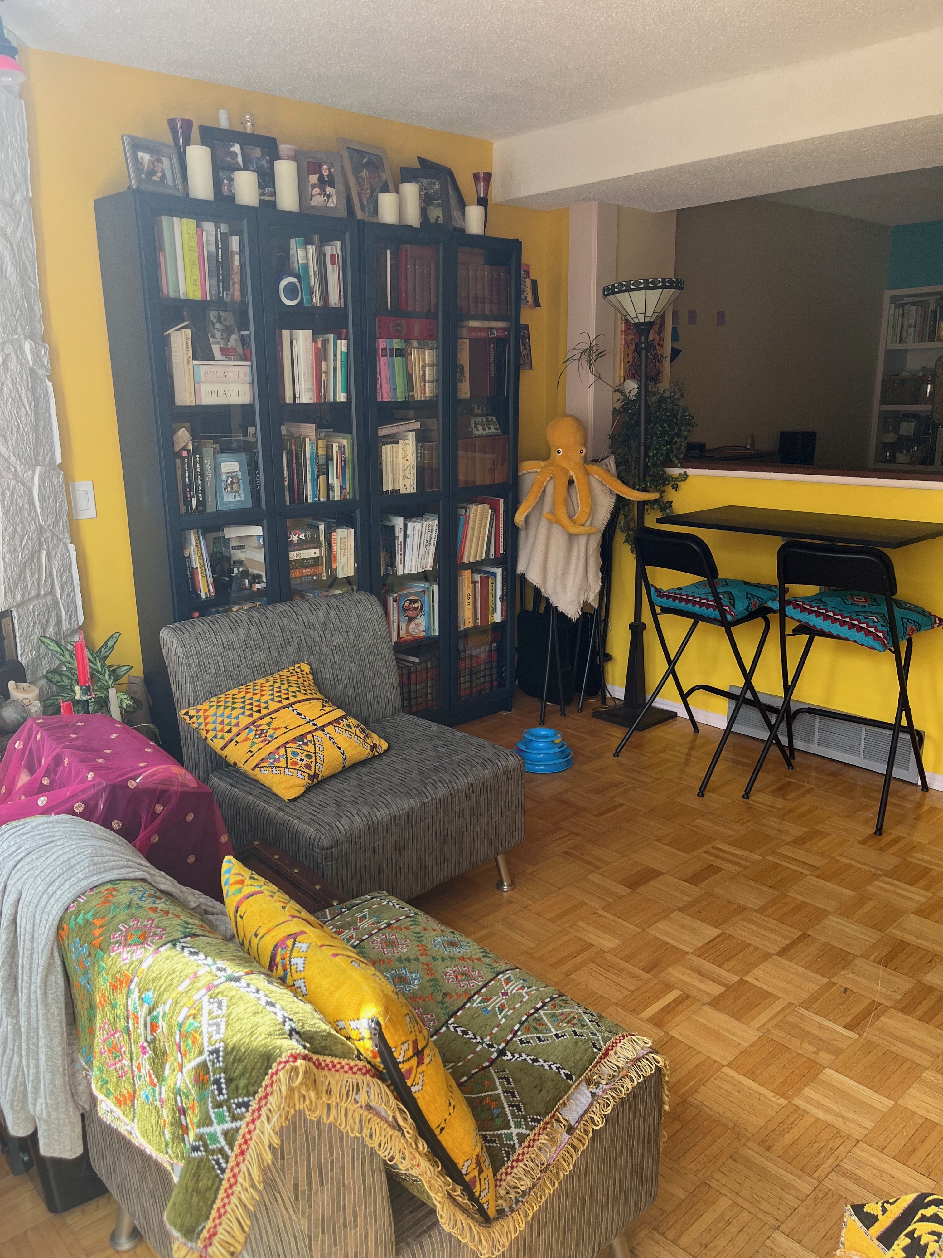 The bedroom is perfect. Yes, I’d like new pillows and sheets, but what I have is functional and cute. The bed is pretty amazing, a solid cherrywood four poster I inherited when my parents downsized. I painted the walls purple and the closet alcove yellow. Then I tore out the closet rail and shelf and replaced it with a bookshelf, on which I’m storing 10+ years of journals, and a desk.