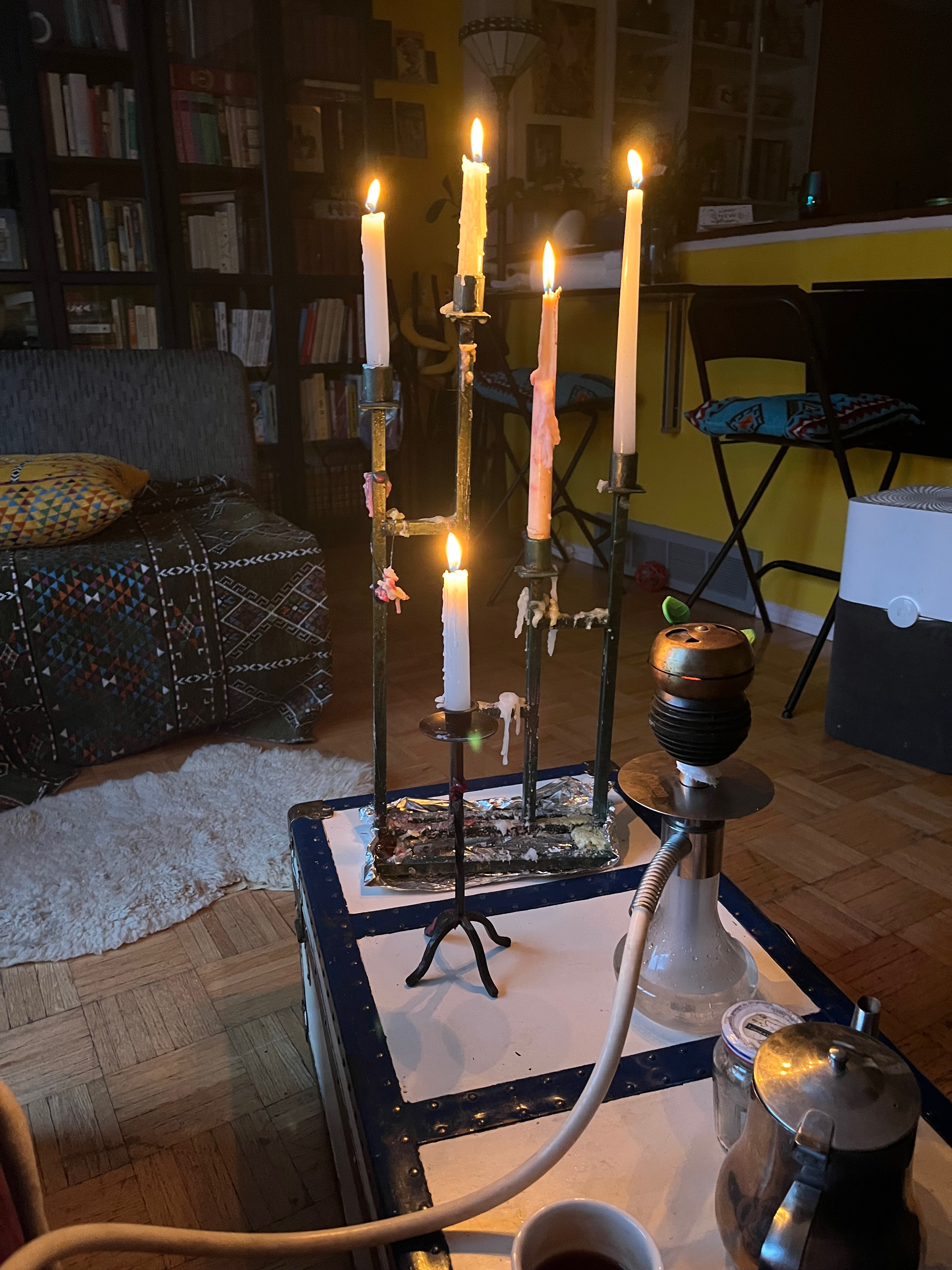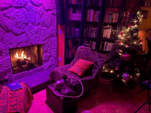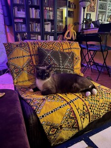 The living room is cozy. It really is just about perfect. I dream of a Roche Bobois Mahjong couch, but I’ve achieved the same effect with my purple velvet chaise lounge, acquired second-hand from a friend who was downsizing, four low and fat armchairs, $40 each at the Restore, and blankets and pillow covers from Khan el-Khalili in Cairo.