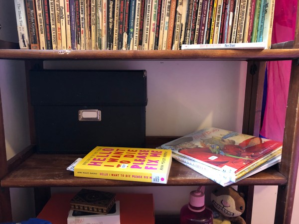 A shelf of battered Ngaio March paperbacks, tucked beside them some meditation and Kundalini yoga books that I’m not using right now, but, maybe, one day, I am not ready to give up on this part of myself yet. Below, a shelf of even more battered Rex Stout paperbacks.