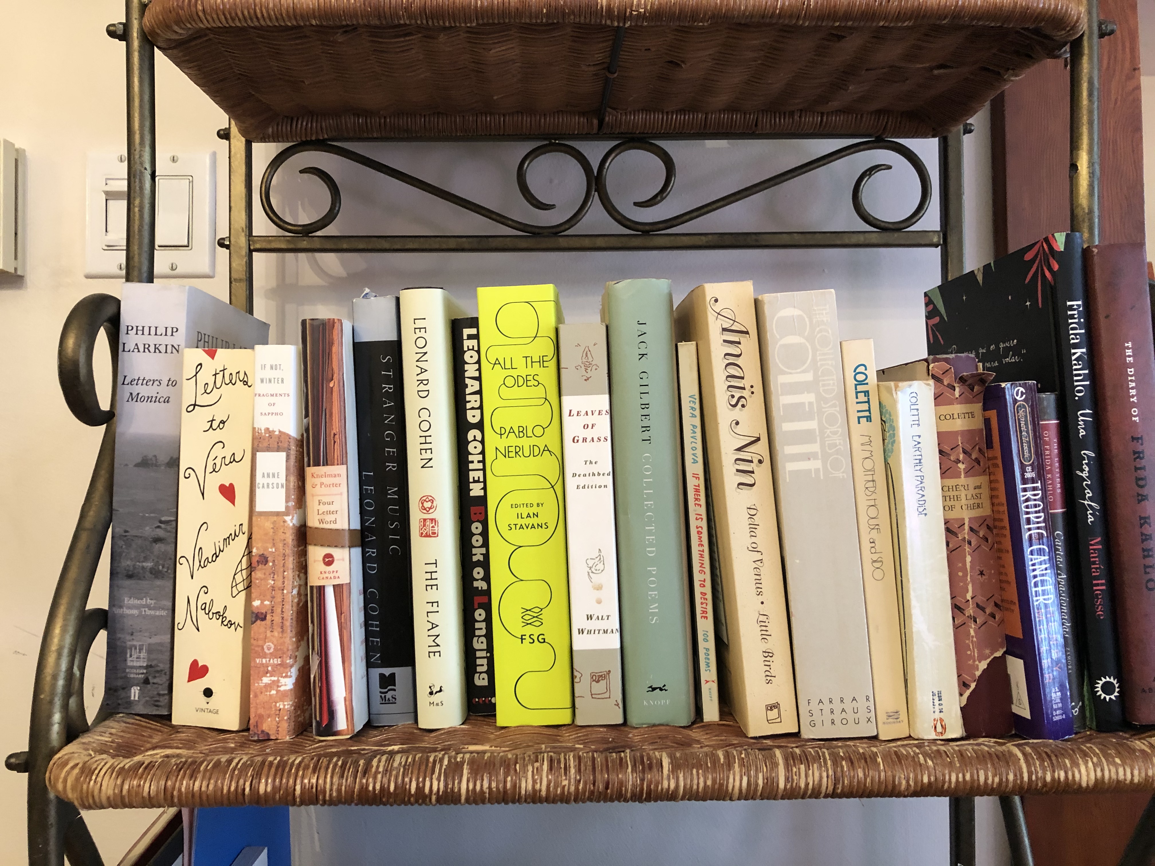 Then, Leonard Cohen, Pablo Neruda, Walt Whitman, Jack Gilbert, Vera Pavlova. Finally, Anaïs Nin’s Delta of Venus and Little Birds, and a bunch of battered Colettes. Henry Miller’s Tropic of Cancer right next to Colette, of course. Then, my Frida books.