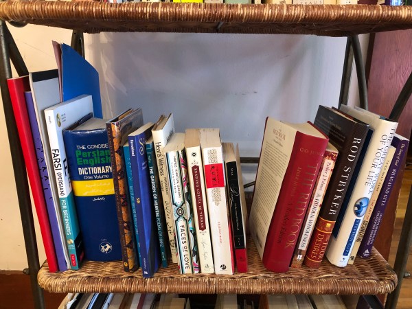 Farsi textbooks next to Hafez, Rumi and Forough Farrokzad translations. I will never be able to read Hafez in the original Persian. But maybe? Life is long. Maybe, one day, I will have time. Then, Jung’s Red Book, Parker J. Palmer’s A Hidden Wholeness, Rod Stryker’s The Four Desires, Stephen Cope’s The Great Work of Your Life, Thich Nhat Hahn’s The Art of Communicating (I failed), The Bhagavad Gita (still trying).