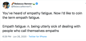 PS Do, by all means, bring forth genuine expressions of empathy—we’ve never needed real empathy more. Hint: such expressions generally do not need to be preceded by the phrase, “As an empath, I…” Empaths focus on other people, notice and respond to what other people are feeling. Narcissists focus on themselves. I know it’s a blurry, hard-to-discern line, but it’s there. Find it.